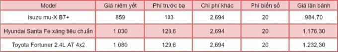 Toyota Fortuner là mẫu SUV 7 chỗ có nhiều lựa chọn nhất với tổng cộng 7 phiên bản, giá bán dao động từ 995 triệu đồng đến 1,426 tỷ đồng. Trong đó, phiên bản số tự động rẻ nhất là 2.4L AT 4x2, có giá niêm yết 1,08 tỷ đồng, cộng hết chi phí để lăn bánh, xe có giá khoảng 1,232 tỷ đồng.
