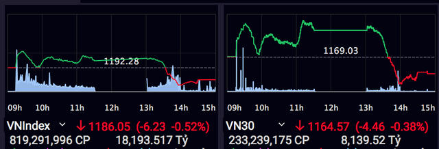 VN-Index sau khi đạt được mức 1.197,12 điểm ở đầu phiên chiều lập tức rơi mạnh xuống mức 1183,44 điểm lúc 14h tức mất gần 14 điểm chỉ trong 1 tiếng giao dịch. Song, ngay từ thời điểm này, biên độ giảm của chỉ số đã được thu hẹp lại.