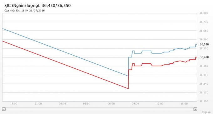 Cụ thể: phiên giao dịch chiều 21/7, cập nhật lúc 18h, giá vàng SJC của Công ty vàng bạc đá quý Sài Gòn niêm yết giảm 90 - 120 nghìn đồng/lượng ở hai chiều mua và bán, hiện giao dịch mức 36,33 - 36,66 triệu đồng/lượng (mua vào - bán ra).