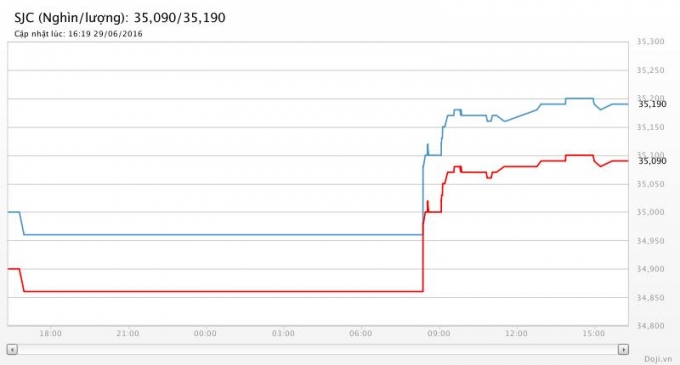 Cập nhật giá vàng trong nước lúc 16h chiều ngày 29/6, Giá vàng SJC niêm yết ở mức 34,920 - 35,240 triệu đồng/lượng, mức này tăng thêm 30.000 đồng/lượng cả 2 chiều mua và bán so với phiên giao dịch lúc 10h30.