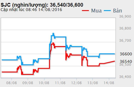 Mở phiên đầu tuần(8/8) tại mốc 36,36- 36,62 triệu đồng/lượng (mua vào- bán ra), vàng SJC đi ngang trong 2 phiên đầu tuần và chỉ thực sự bứt phá vào phiên 10/8 khi nỗ lực tiệm cận vùng 37 triệu đồng/lượng nhưng không thành (36,57- 36,83 triệu đồng/lượng).