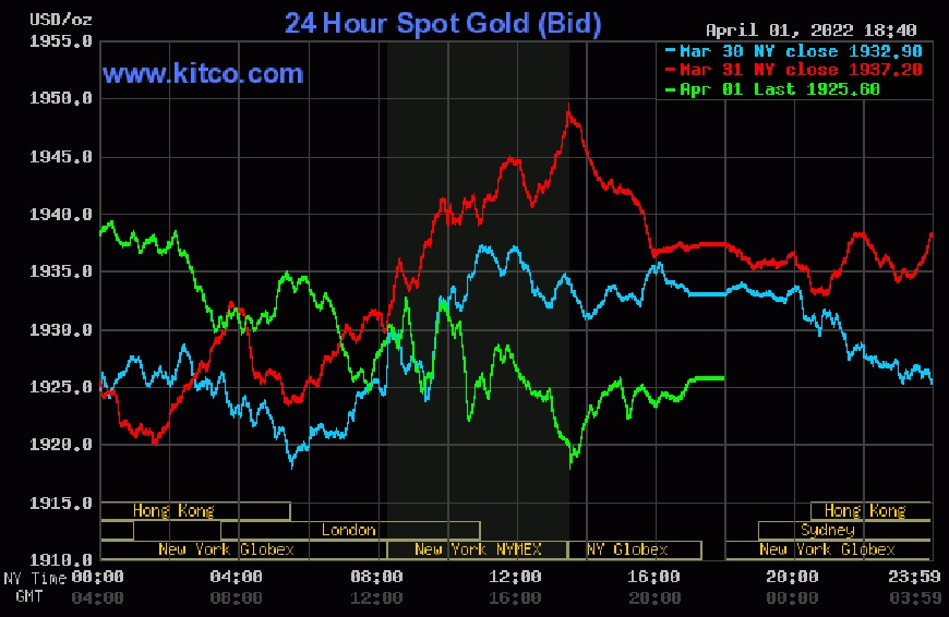 Giá vàng thế giới rạng sáng 2-4 (giờ Việt Nam) niêm yết tại Kitco là 1.925,6 USD/ounce, tương đương khoảng 53,3 triệu đồng/lượng.