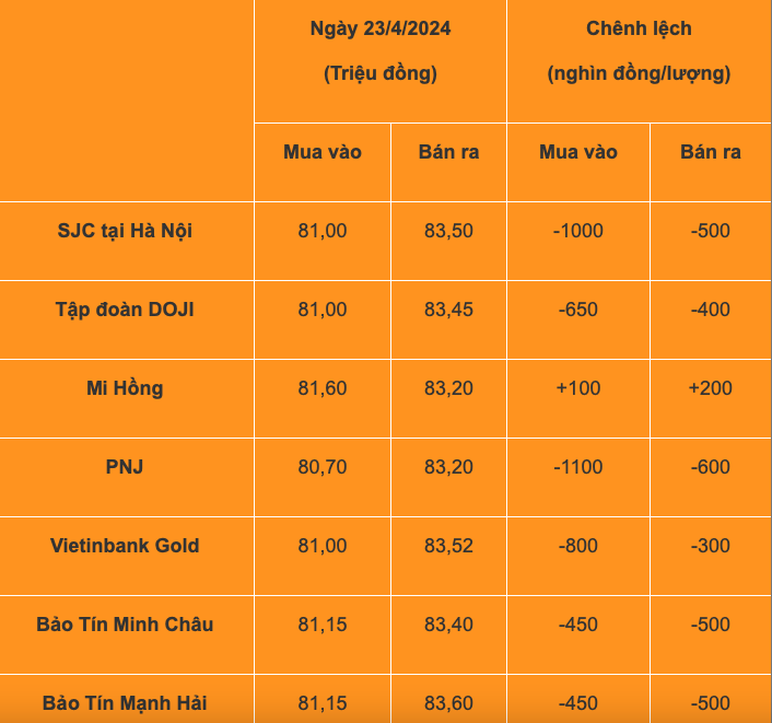 Bảng giá vàng hôm nay 23/4/2024 mới nhất như sau:
