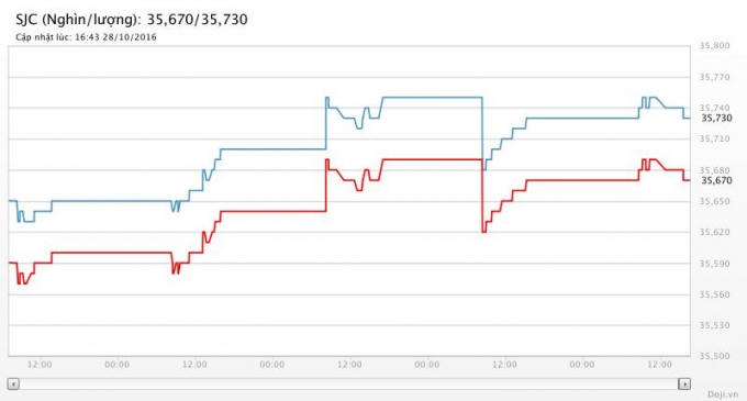 Trong tuần, mức giá thấp nhất chứng kiến là 35,43- 35,63 triệu đồng/lượng (ngày 25/10) và mức giá cao nhất là 35,58- 35,81 triệu đồng/lượng (ngày 28/10). Đây cũng là mức giá cao nhất kể từ đầu tháng mà vàng có được.