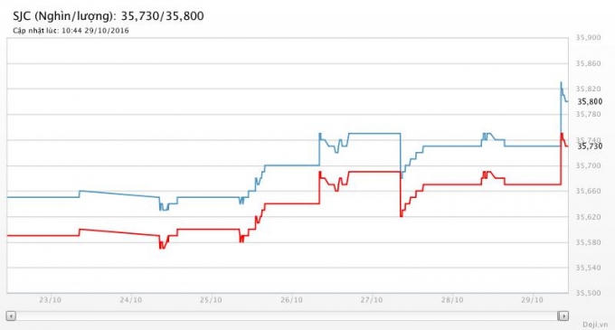 Trong tuần, mức giá thấp nhất chứng kiến là 35,43- 35,63 triệu đồng/lượng (ngày 25/10) và mức giá cao nhất là 35,58- 35,81 triệu đồng/lượng (ngày 28/10). Đây cũng là mức giá cao nhất kể từ đầu tháng mà vàng có được.