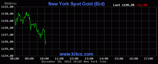 Theo tin nhanh, đầu giờ sáng 21/12 (giờ Việt Nam), giá vàng thế giới giao ngay đứng ở mức 1.127,8 USD/ounce, giảm khoảng 10 USD so với cùng giờ sáng qua. Giá vàng đêm qua trên thị trường New York có lúc đã xuống tới gần 1.125 USD/ounce.