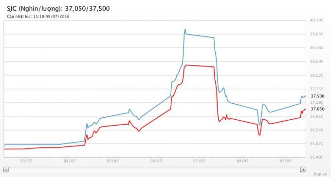 Tính riêng phiên giao dịch hôm 6/7 giá vàng quốc tế tăng 8 USD/oz từ 1366 – 1375 USD/oz tương ứng 0.5%, thì giá vàng trong nước tăng 1.7 triệu đồng/lượng tương ứng với 4.5%.
