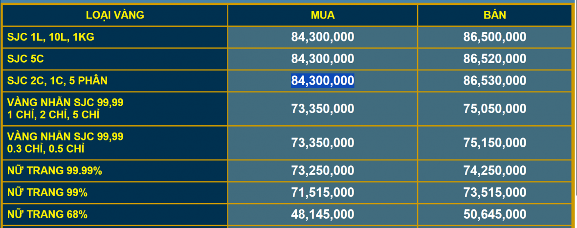 Trong khi đó, tại Doji, giá vàng SJC đang được niêm yết ở mức 84,3 – 85,8 triệu đồng/lượng (theo chiều mua vào – bán ra).