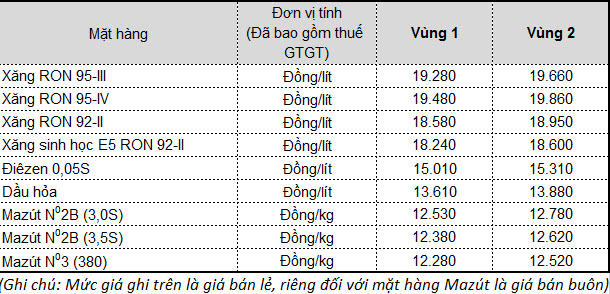 Dầu hỏa tăng 419 đồng/lít, bán ra ở mức 13.617 đồng/lít. Dầu mazut tăng 473 đồng/lít, bán ra ở mức 12.382 đồng/lít.