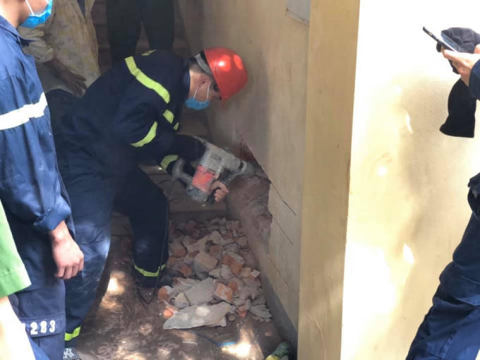 Lực lượng chức năng cắt tường tại vị trí nạn nhân mắc kẹt.