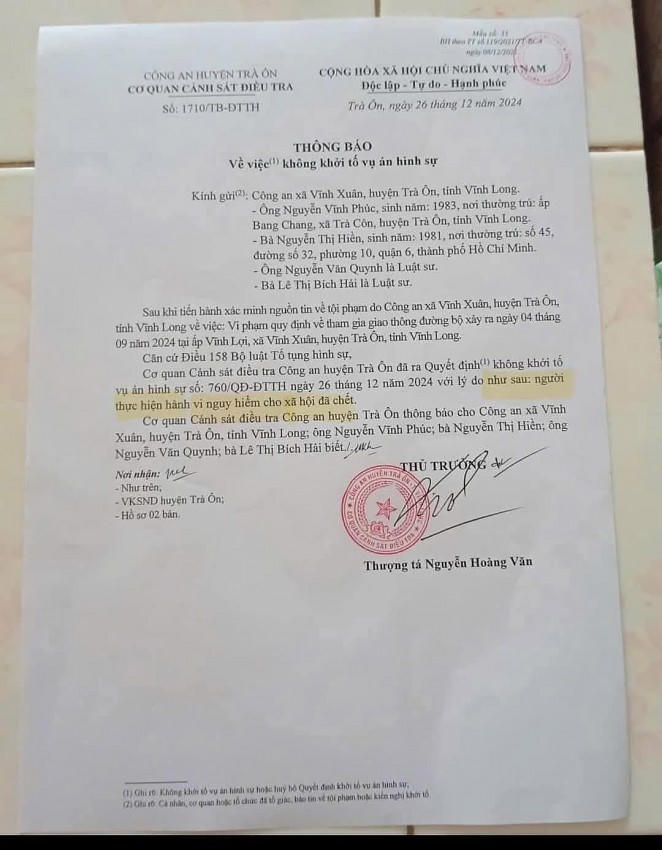 Ngoài nhận định và kết luận không đúng về hành vi của tài xế xe tải Trung nêu trên, dẫn tới không khởi tố vụ án và khởi tố bị can, Cơ quan cảnh sát Điều tra - Công an huyện Trà Ôn trong Thông báo ban đầu còn nêu lý do của việc không khởi tố: “Người thực hiện hành vi nguy hiểm cho xã hội đã chết”.