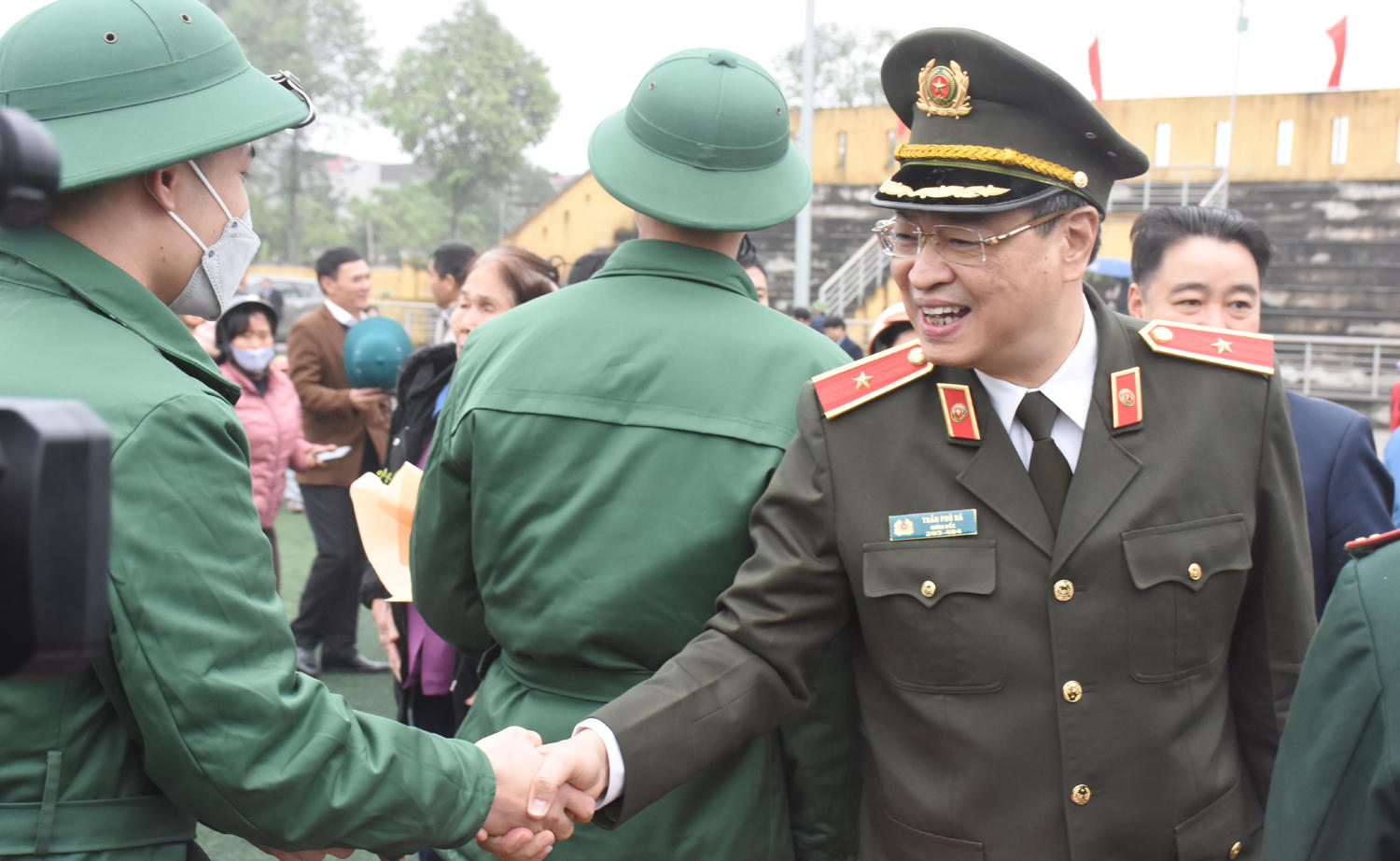 Thiếu tướng Trần Phú Hà, Giám đốc Công an tỉnh tặng hoa, tặng quà động viên các đơn vị nhận quân và các chiến sĩ mới.