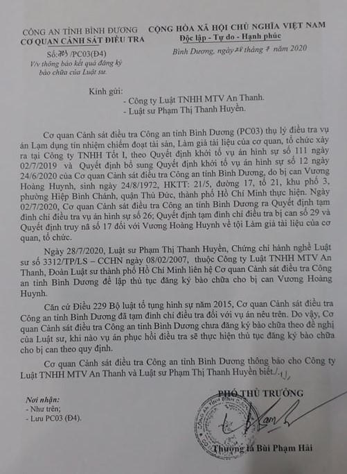 Văn bản số 703/PC03 ngày 28/7/2020 của Công an tỉnh Bình Dương.