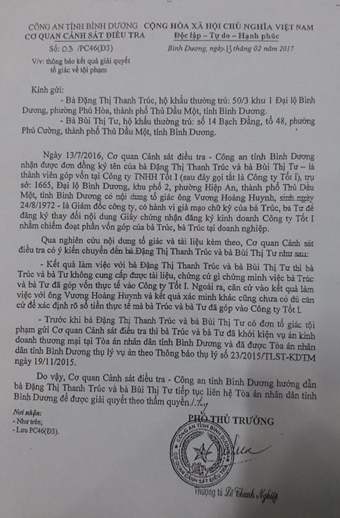Thế nhưng, sau khi xem xét hồ sơ vụ việc thì đến ngày 13/2/2017 Cơ quan CSĐT Công an tỉnh Bình Dương đã có văn bản số 03/PC46 về việc thông báo kết quả giải quyết tố giác tội phạm gửi cho bà Trúc và bà Tư với nội dung cụ thể như sau: “Kết quả làm việc với bà Trúc và bà Tư thì bà Trúc và bà Tư không cung cấp được tài liệu, chứng cứ gì chứng minh việc bà Trúc bà Tư đã góp vốn thực tế vào Cty Tốt I. Ngoài ra, căn cứ vào kết quả làm việc với ông Huynh và kết quả xác minh khác cũng chưa có đủ căn cứ để xác định rõ số tiền thực tế mà bà Trúc và bà Tư đã góp vốn vào Cty Tốt I ”.