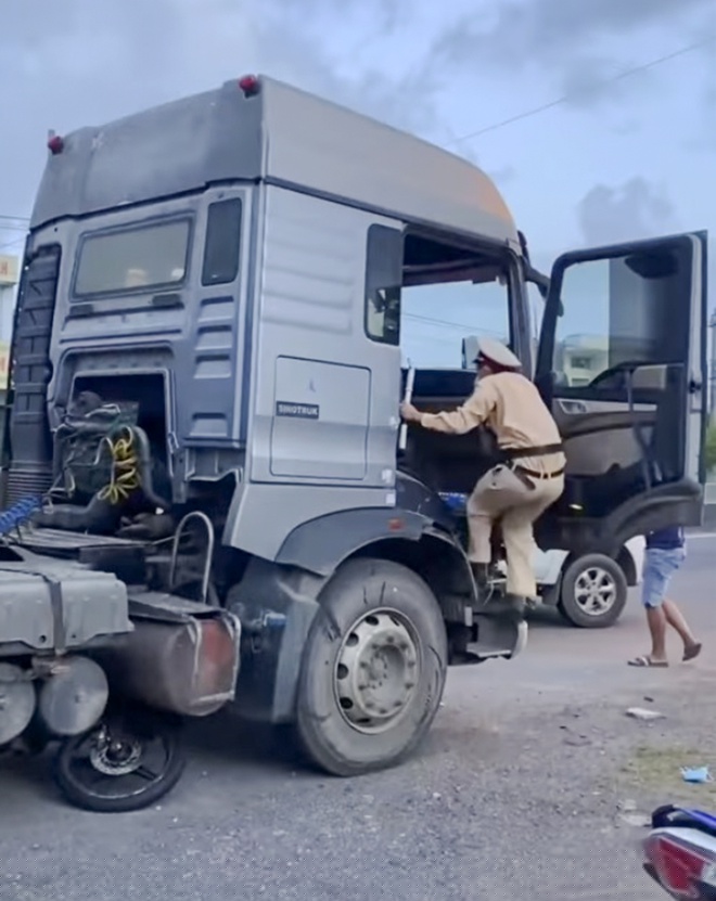 Lúc này, dưới gầm xe đầu kéo vẫn còn một xe máy bị kẹt. Vụ tai nạn đã khiến 2 người tử vong và 13 người bị thương nặng. Ngoài ra, xe đầu kéo và hàng loạt xe máy của các nạn nhân bị hư hỏng.