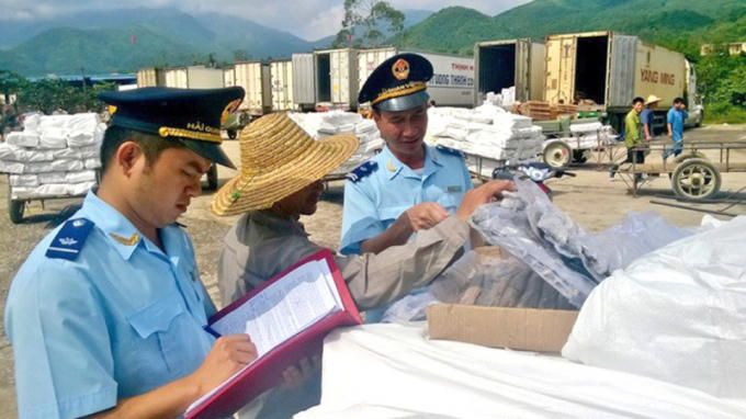 Lực lượng chức năng kiểm tra hàng hóa chống gian lận xuất xứ.