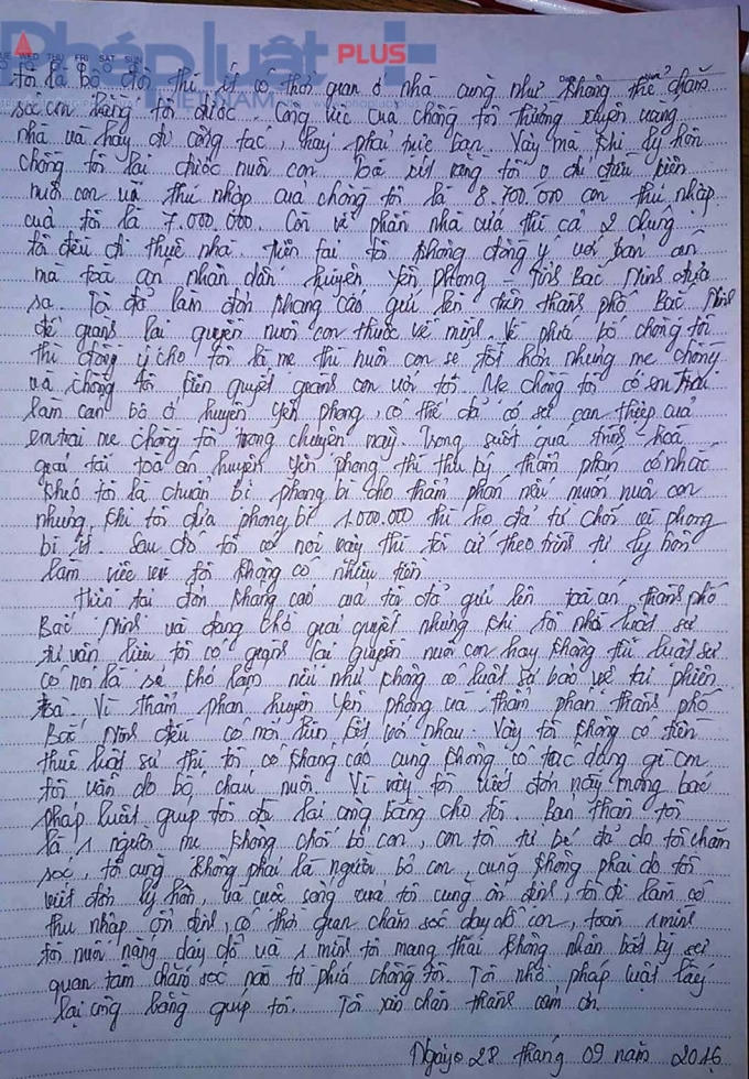 “Không thể vì không có tiền, không có địa vị mà tôi lại mất đi quyền nuôi dạy đứa con dứt ruột đẻ ra. Bản thân tôi cũng chưa bao giờ có ý định bỏ rơi con mình và để con cho người khác nuôi tôi không yên tâm. Kính mong Tòa án Nhân dân Thành phố Bắc Ninh xem xét trường hợp của tôi” - chị Nhung bộc bạch.