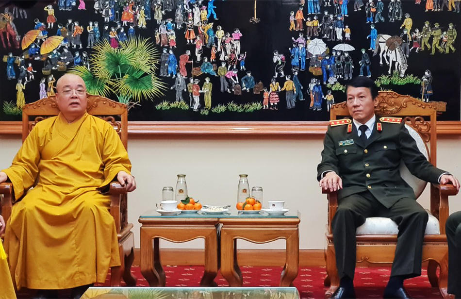 Nhân dịp này, Hòa thượng gửi lời chúc tốt đẹp đến lãnh đạo Bộ Công an và toàn thể cán bộ, chiến sĩ lực lượng Công an nhân dân nhân dịp Tết Nguyên đán Quý Mão 2023 an lạc, sức khỏe, hoàn thành xuất sắc nhiệm vụ, giữ vững bình yên cuộc sống và hạnh phúc cho nhân dân.