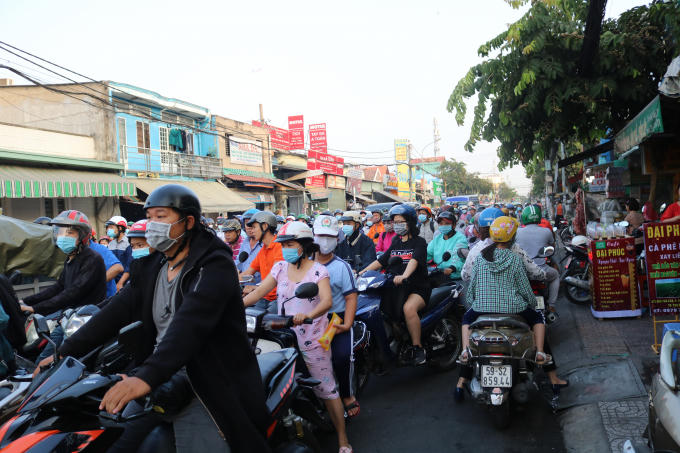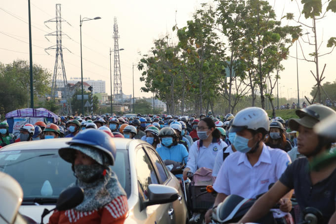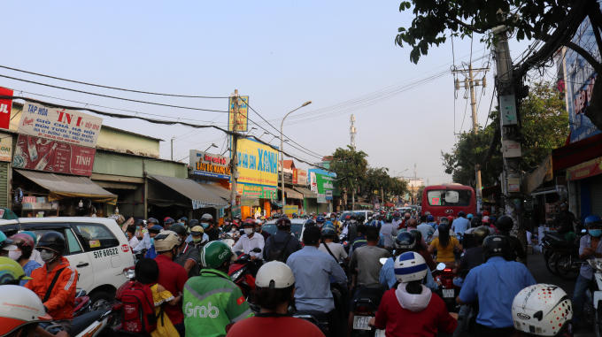 Sáng 19/3, hàng trăm ô tô, xe máy xếp hàng dài, không thể di chuyển qua giao lộ Hiệp Bình - Kha Vạn Cân, phường Hiệp Bình Chánh, thành phố Thủ Đức.