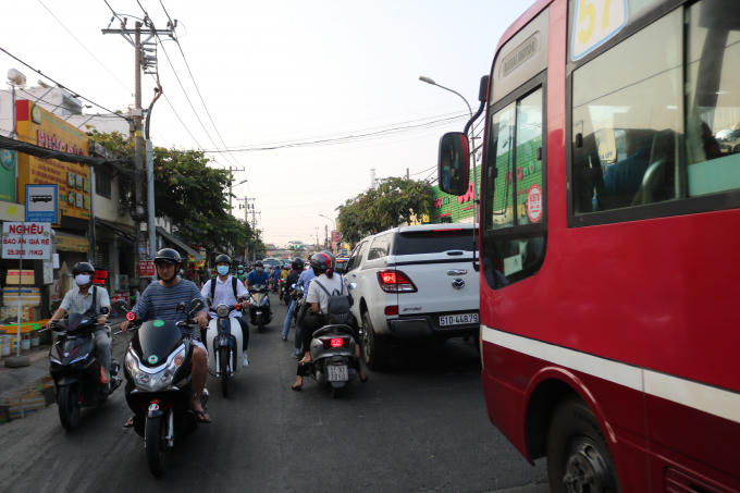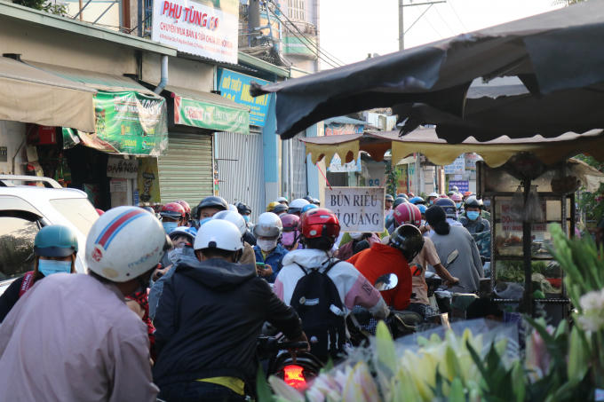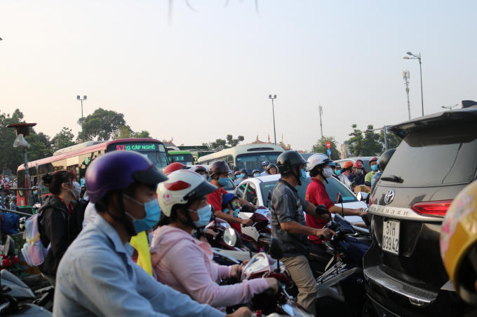 Theo ghi nhận, hàng ngàn phương tiện trên đường Phạm Văn Đồng xếp hàng dài, nhích từng bước. Các con hẻm ra vào giao lộ cũng kín người.