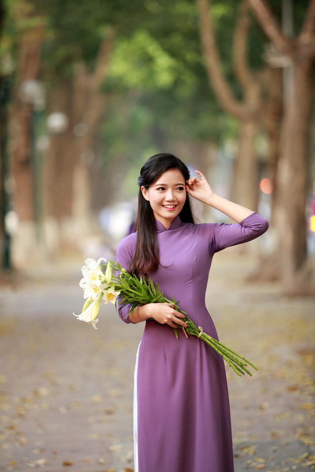 Đã có rất nhiều kỉ niệm gắn với mảnh đất Thủ đô, cô giáo Phan Hồng Anh lựa chọn tà áo dài sắc tím mộng mơ, khoe nét duyên dáng cùng loài hoa loa kèn thanh nhã.