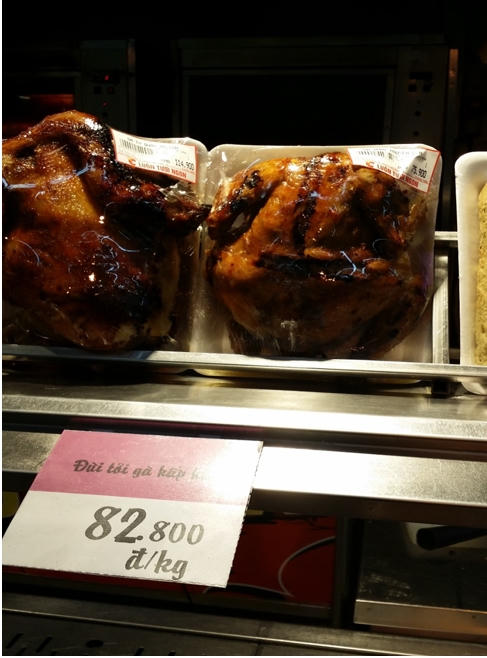 Chị Thảo nhân viên bán gà tại quầy gà ở Big C cho biết: “Các sản phẩm gà quay nguyên con, đùi gà rán cũng rất được ưa chuông giá thành thấp” dao động từ 50.000 tới 120.000 đồng/con.