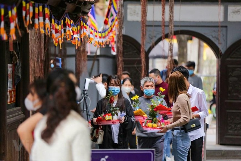 Nhiều bạn trẻ sắm lễ dâng vào chùa với mong muốn tìm được mối duyên ưng ý.