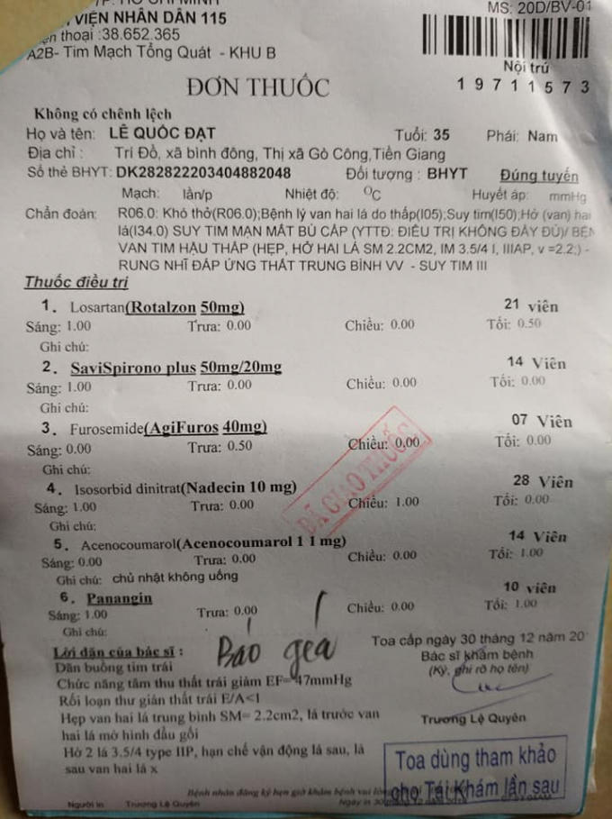 Đơn thuốc để cầm cự kéo dài sự sống của anh Lê Quốc Đạt trong một lần nhập viện
