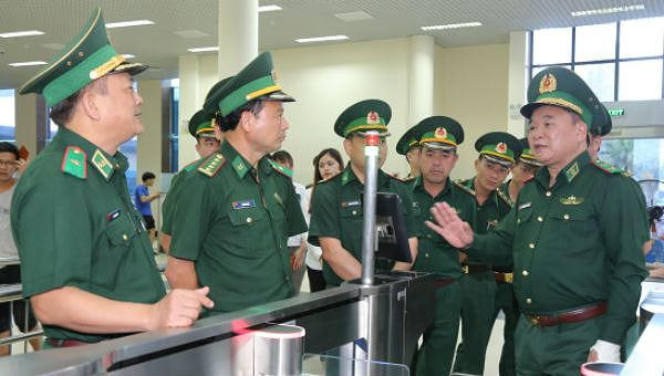 Trung tướng Hoàng Xuân Chiến, Ủy viên Trung ương Đảng, Tư lệnh BĐBP (ngoài cùng bên phải) kiểm tra hệ thống kiểm soát xuất, nhập cảnh tự động tại cửa khẩu quốc tế Móng Cái (Quảng Ninh).