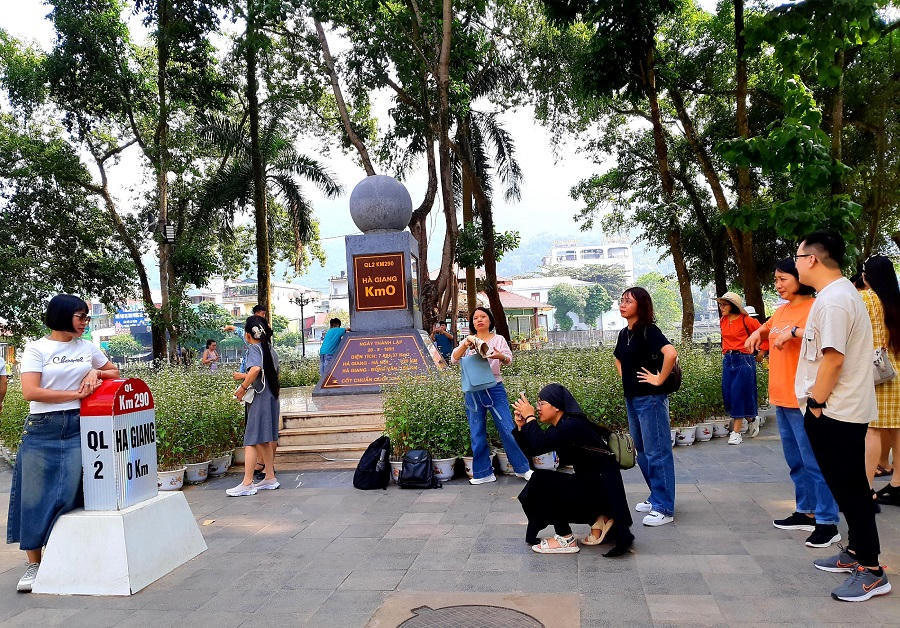 Du khách chụp ảnh tại km 0 tại TP Hà Giang.
