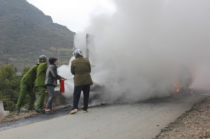 Trên xe lúc này chỉ có tài xế và một phụ xe, hai anh này vội xuống xe dùng bình cứu hỏa mini để dập lửa. Ngay sau đó lực lượng chức năng huyện Mèo Vạc cũng có mặt hỗ trợ dập lửa.