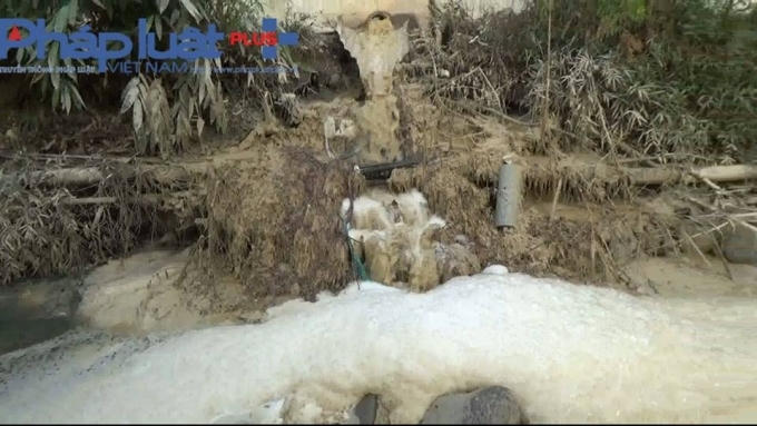 Men theo bể chứa của nhà máy, phóng viên Pháp luật Plus phát hiện nhiều lỗ cống và ống nhựa cỡ lớn được đặt sẵn xả trực tiếp ồng ộc ra suối tạo thành những tảng váng bọt vàng khè bốc mùi tức ngực khó chịu.