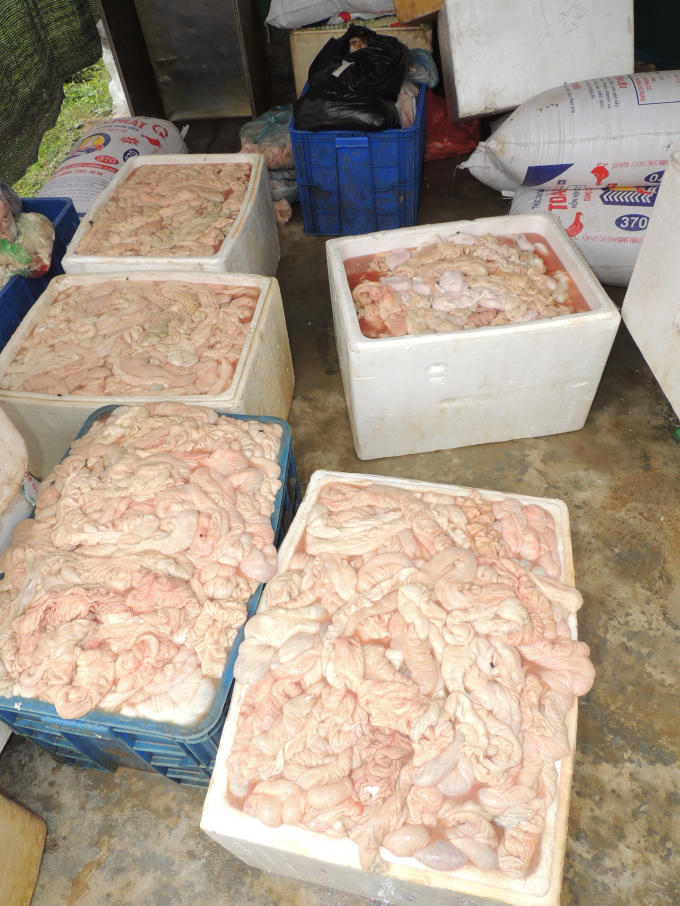 Kiểm tra cơ sở chế biến nội tạng động vật của đối tượng Nguyễn Thị Huyền, lực lượng chức năng tiếp tục thu giữ hơn 1,1 tấn lòng lợn đang trong giai đoạn phân hủy, bốc mùi hôi thối đựng trong các thùng xốp ngâm dung dịch hóa chất và đá để bảo quản.
