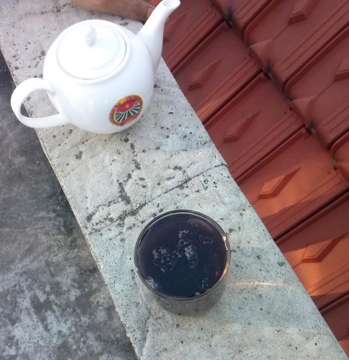 Và để chứng minh cho chúng tôi thấy, ông Thiết dẫn chúng tôi lên tầng 2 của ngôi nhà múc lấy một cốc nước giếng khoan được lọc ở bể chứa. Rồi anh từ từ đổ vài giọt nước chè vào trong cốc. Nước chè nhỏ đến đâu thì nước biến màu đến đấy, chỉ sau vài giây toàn bộ nước trong cốc chuyển sang màu tím than, có váng ga sủi lên mặt nước, có mùi tanh nồng rất khó chịu.