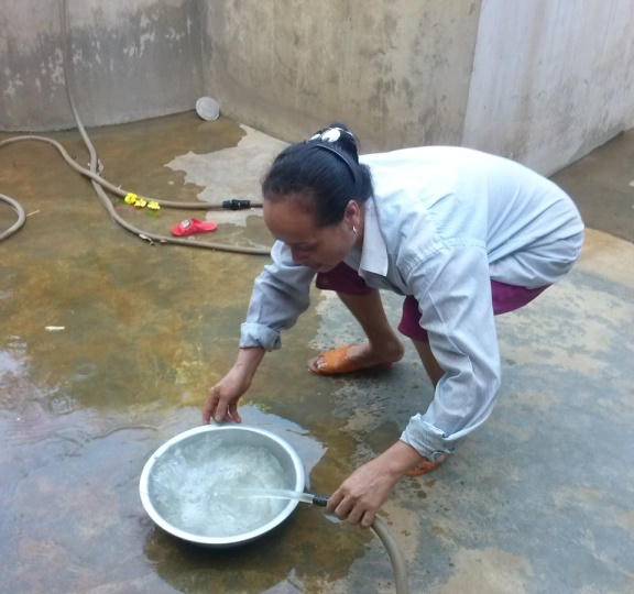 Chỉ cần pha một ấm trà từ nước giếng khoan, sau đó lấy một chén chè đổ từ từ xuống cốc nước lọc được lấy từ bể chứa thì ngay lập tức cốc nước lọc chuyển thành màu tím than, sủi bọt và có mùi tanh nồng.