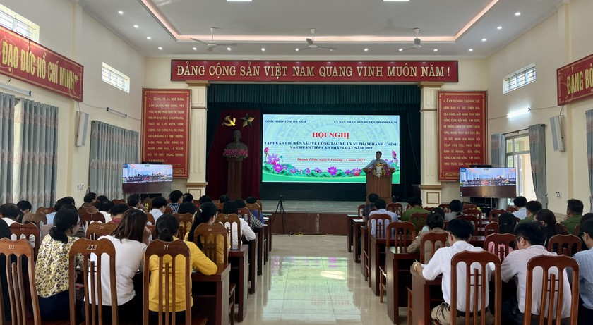 Nhằm hưởng ứng Ngày Pháp luật Việt Nam 2022, sáng 4/11, Sở Tư pháp Hà Nam phối hợp UBND huyện Thanh Liêm tổ chức Hội nghị Tập huấn chuyên sâu về công tác xử lý vi phạm hành chính và chuẩn tiếp cận pháp luật năm 2022.