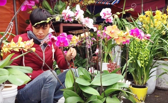 | Chậu Lan Hồ Điệp đang được người bán căn chỉnh trước khi bàn giao cho khách. |
