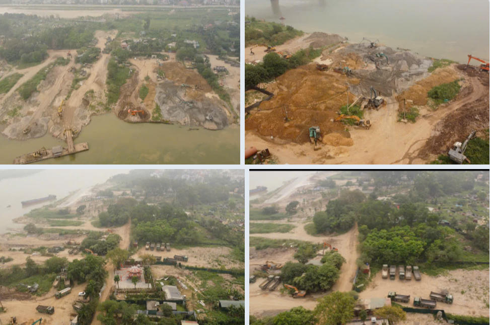 Quan sát từ trên cao, các bãi trung chuyển này còn tự ý làm kè lấn ra lòng sông Hồng để phục vụ việc bốc dỡ hàng hóa từ dưới tàu lên. Những "núi" cát, đất cao ngất ngưởng được chất đống sát mép nước, không chỉ gây mất mỹ quan mà còn có dấu hiệu xâm phạm hành lang bảo vệ sông, cản trở trực tiếp đến dòng chảy và khả năng thoát lũ trong mùa mưa bão.