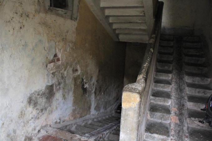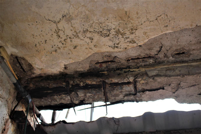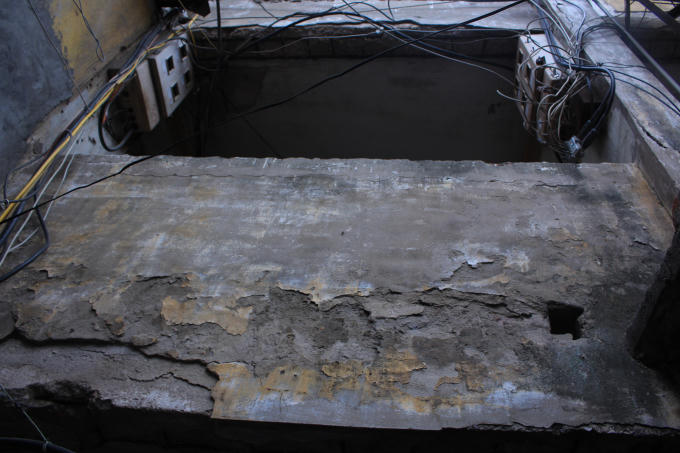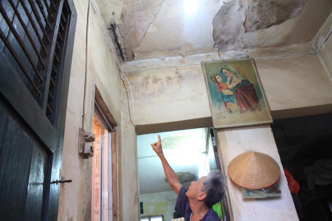 Bà Phạm Thị Thúy, sống ở phòng 17, nhà K52 đưa chúng tôi vào căn nhà của bà và cho biết: “Mưa xuống đi theo các vết tường nứt chảy vào gây ẩm mốc, hư hại cho nhà. Các mảng tường ở đây thường xuyên bị nứt vỡ thành từng mảng, các dầm sắt trên trần nhà cũng lộ hết cả ra. Cuộc sống sinh hoạt của gia đình gặp rất nhiều bất tiện, thậm chí nguy hiiểm”.