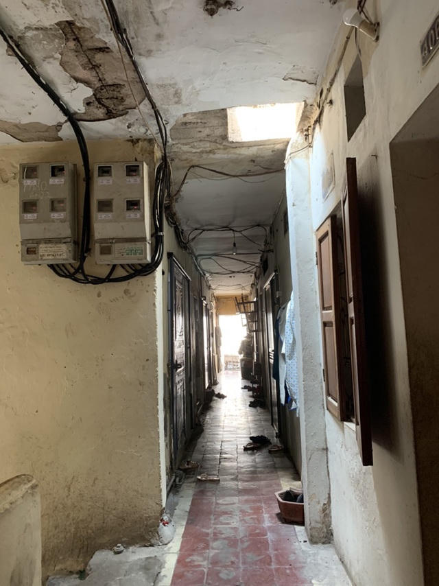 Phần hành lang nhỏ hẹp xuống cấp, trần hành lang bong tróc hết lớp vữa, trơ cốt thép gỉ cùng hệ thống dây điện chằng chịt ở một chung cư cũ khu vực Ngã Tư Sở, Đống Đa, Hà Nội.