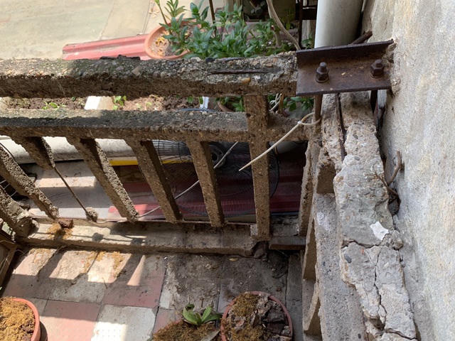 Khu vực ban công chung tại một khu chung cư xuống cấp, kết cấu bê tông cũ nứt vỡ, nhiều vị trí lộ cốt thép đã han gỉ không còn liên kết tiềm ẩn nhiều rủi ro cho cộng đồng dân cư.