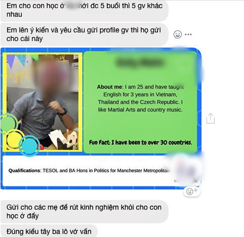 Khi chị yêu cầu gửi thông tin hồ sơ cá nhân của giáo viên thì được gửi cho một bức ảnh, kèm với ít thông tin đơn giản về tên, tuổi, kinh nghiệm, sở thích và chứng chỉ đang có.