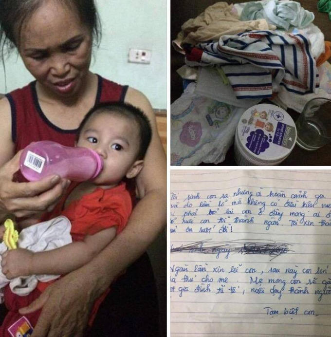 Người mẹ bỏ lại cháu bé, cùng với nội dung bức tâm thư: “Tôi sinh con ra nhưng vì hoàn cảnh gia đình và do lầm lỡ mà không có điều kiện nuôi con. Tôi phải bỏ lại con ở đây mong ai đó giúp đỡ nuôi con tôi thành người. Tôi xin thành tâm cảm ơn suốt đời”.