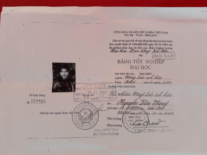Theo đó, trong hồ sơ lý lịch, ông Hưng sử dụng bằng Đại học mang số hiệu A259868, hệ Đại học tại chức, do Trường Đại học Lao động – Xã hội cấp ngày 15/10/2009. Tuy nhiên, người dân cho biết ông Hưng không theo học tại trường này, không hiểu vì sao vẫn có bằng tốt nghiệp.
