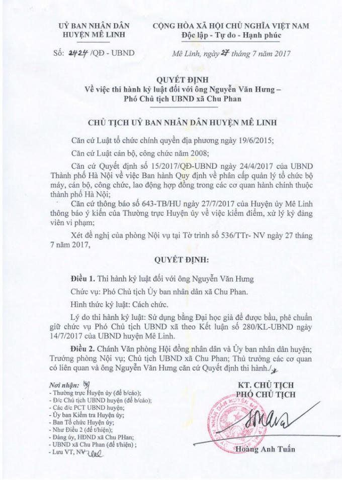 Ngày 27/7/2017, sau khi tiến hành công tác kiểm điểm tại xã Chu Phan đối với ông Nguyễn Văn Hưng, rồi công tác xét họp kỉ luật và đề xuất của hội đồng kỉ luật. Chủ tịch UBND huyện Mê Linh ban hành Quyết định 2424/QĐ-UBND về việc thi hành kỷ luật cách chức Phó Chủ tịch UBND xã Chu Phan đối với ông Nguyễn Văn Hưng.