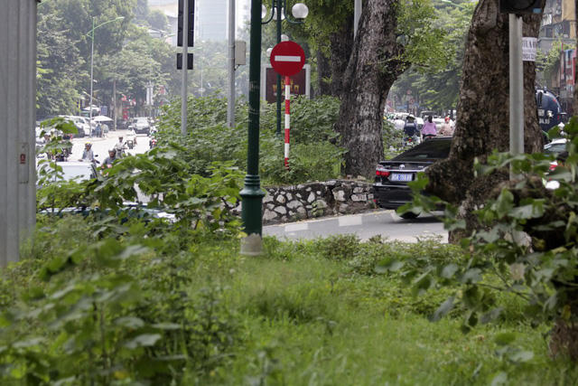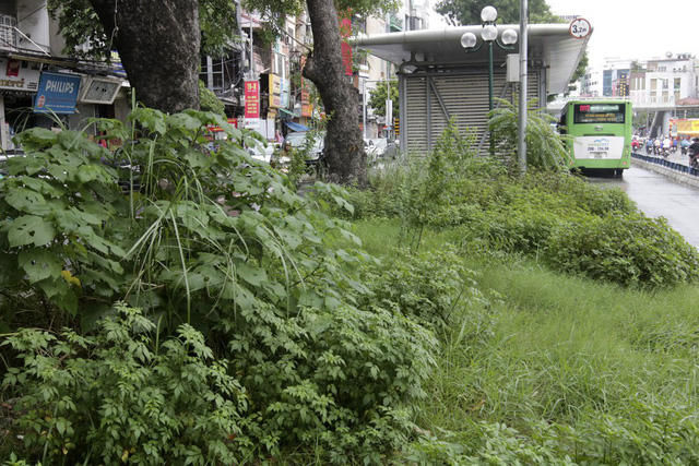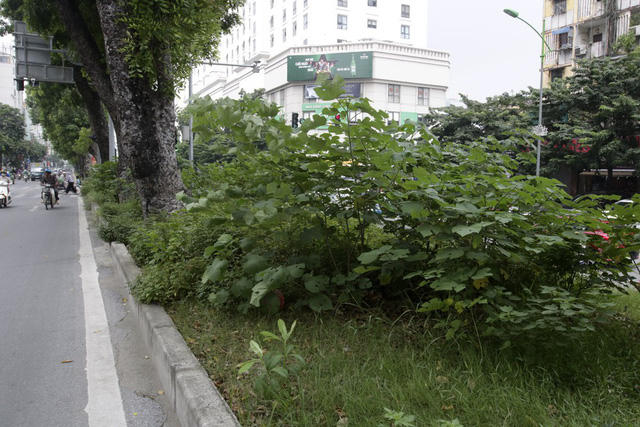Dải phân cách cứng giữa phố Giảng Võ (quận Ba Đình, Hà Nội) thời gian gần đây giống như bãi hoang vì cây dại mọc um tùm không có người cắt tỉa.