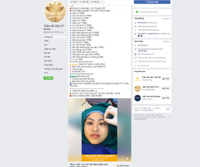 Như đã thông tin cơ sở thẩm mỹ viện (TMV) NT Korea có địa chỉ tại số 5, ngõ 216, phố Trung Kính, phường Yên Hòa, quận Cầu Giấy, có Giấy đăng ký kinh doanh số 01G8022078, phòng Kinh tế quận Cầu Giấy cấp. Cơ sở này chỉ được thực hiện các dịch vụ làm đẹp chăm sóc da, không phẫu thuật, không gây chảy máu…Thế nhưng, lại quảng cáo những hoạt động xâm lấn như phẫu thuật nâng mũi, tiêm filler, cắt, nhấn mí mắt…