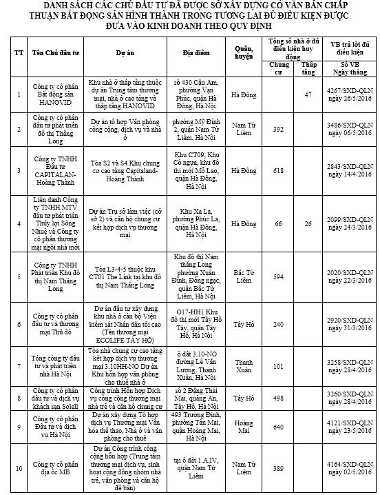 Trước đó, hồi cuối tháng 2/2016, Sở Xây dựng Hà Nội cũng đã công bố danh sách 26 chủ đầu tư được Sở chấp thuận bất động sản hình thành trong tương lai đủ điều kiện được đưa vào kinh doanh theo quy định.
