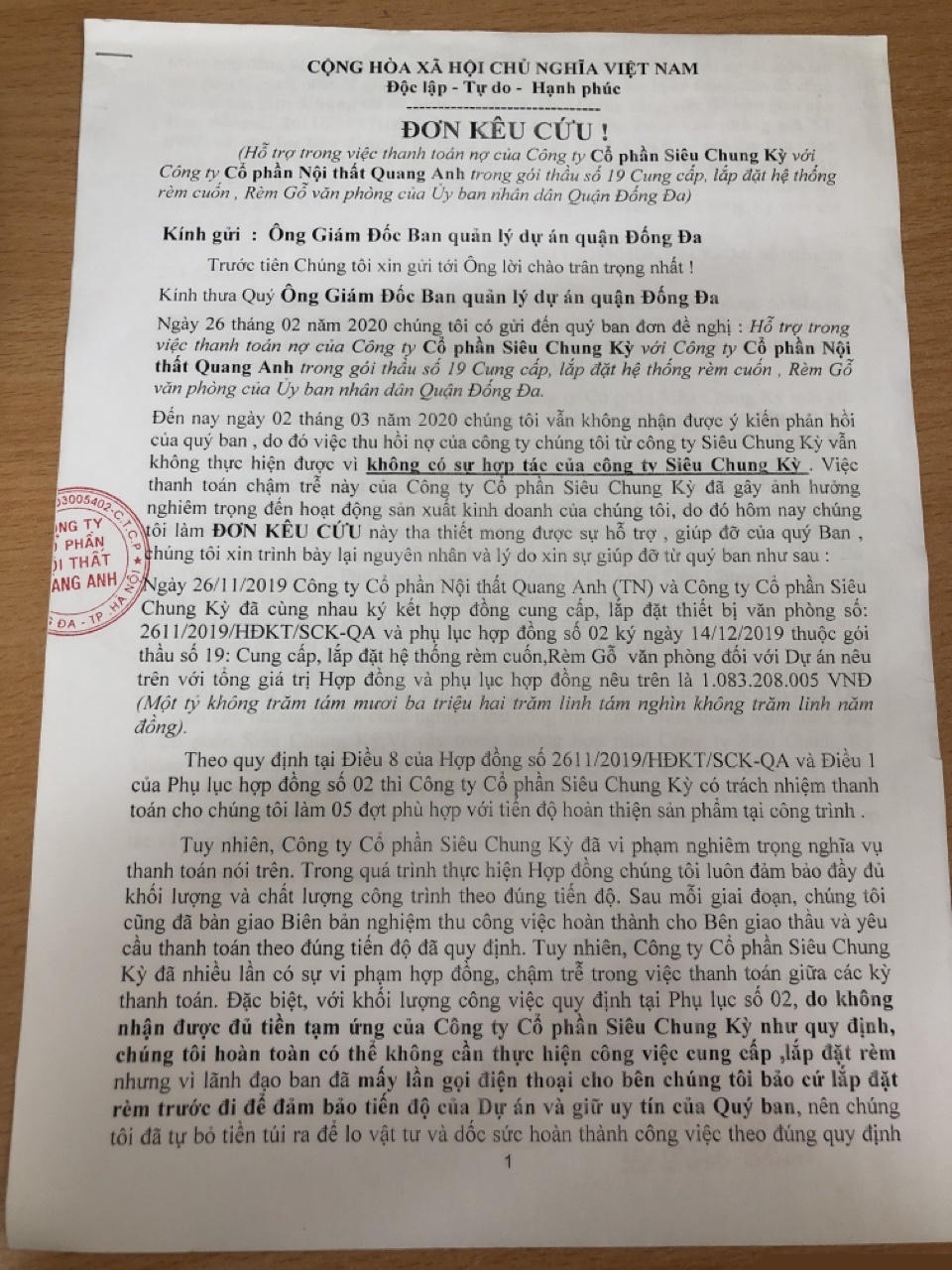 Cụ thể, Báo điện tử Xây dựng nhận được đơn phản ánh của Công ty cổ phần Nội thất Quang Anh về Công ty cổ phần Siêu Chung Kỳ chậm trễ trong việc thanh toán nợ gói thầu số 19 Thiết bị văn phòng tại dự án Xây dựng trụ sở Quận ủy, HĐND, UBND quận Đống Đa.