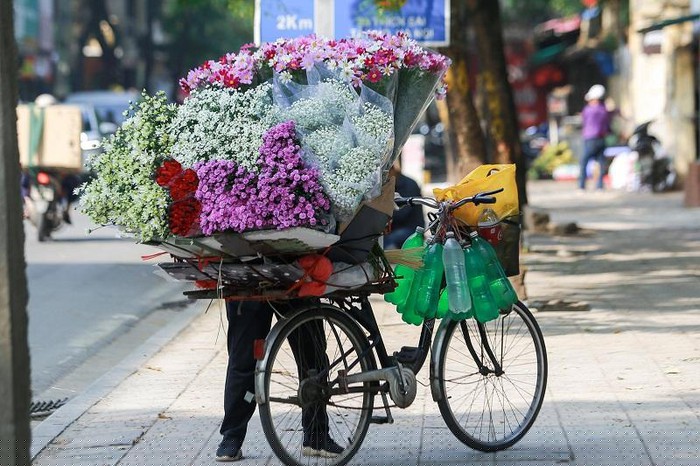 Trên các con phố như Phan Đình Phùng, Thanh Niên, Thụy Khuê... không khó để bắt gặp những chiếc xe đạp cũ kĩ chở đầy hoa cúc họa mi.